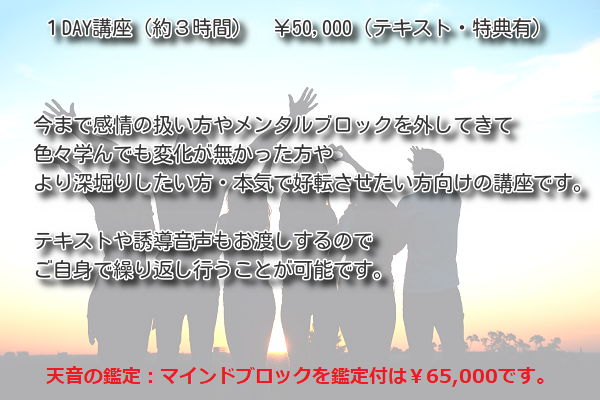 時間:2時間半(開始10:00~18:00の間) 料金:通常価格75,000円 複数名での受講も可能です。 2名以上でのお申込みは割引価格での提供が可能です。 ペアでのご参加・ご夫婦は、通常価格65,000円 |